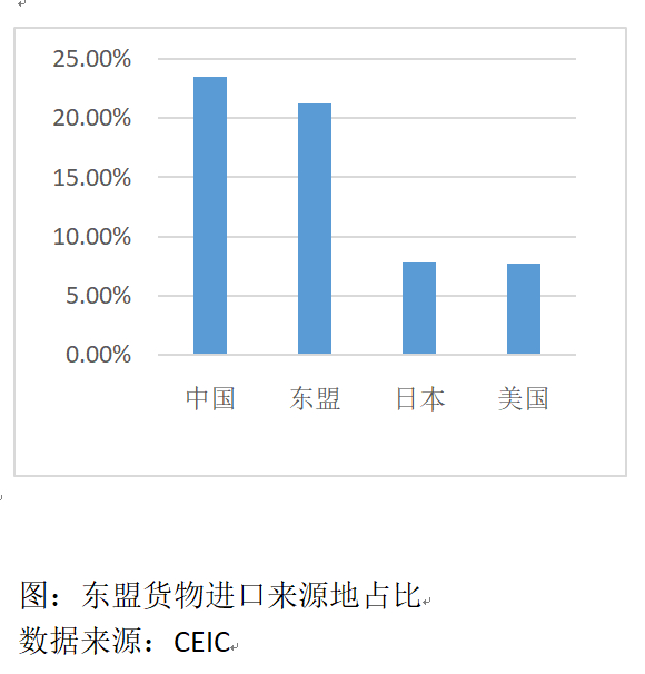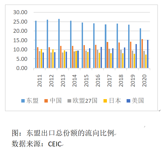 第一,近年来中国与东盟地区经济稳定增长,双方互为最重要的贸易伙伴之一,是双边跨境电商合作快速发展的重要背景。多年来,中国经济保持中高速增长,形成完备的产业链,使中国成为东盟初级产品、中间产品的重要出口地。随着中国经济中服务业占比不断提升,居民消费端呈现多元化态势,对东盟最终产品和服务的需求快速提升,为中国与东盟的跨境电商合作提供了持续动力。与此同时,随着东盟经济共同体(AEC)建设力度加大,《AEC发展蓝图2025》推进落实,东盟已经成为域内零关税(或较低关税)的单一市场,资源流动更加顺畅,6.6亿人口的规模红利正在兑现,统一市场的吸引力进一步上升,成为中国的重要出口目的地。2020年,中国占东盟总进口的23.5%,超过东盟自身(21.2%)、日本(7.8%)和美国(7.7%)。