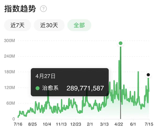 宏观大势和普通人的工作生活状况都在发生改变,沉浸在热搜中的互联网用户,也开始重新思考“诗与远方”的价值。治愈系内容的热度正在悄然上涨。微信指数显示,从2021年7月到2022年7月,关键词“治愈系”呈现螺旋上升趋势,在今年4月份达到了最高峰。