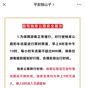 新疆克拉玛依市公安局独山子区分局发布的消息显示,当地从7月12日开始,对行驶独库公路的车流量进行限时限量。早上8时至中午13时,每小时车流量不超过800辆。