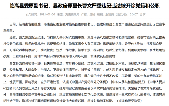 根据省委巡视移交的问题线索,海南省纪委监委严肃查处了临高县委原副书记、县政府原县长曹文严重违纪违法问题。调查发现,曹文利用职务便利,在土地用途改变、工程项目承揽、房地产项目开发等方面为长岛蓝湾房地产项目开发商等人谋取利益,非法收受巨额财物。