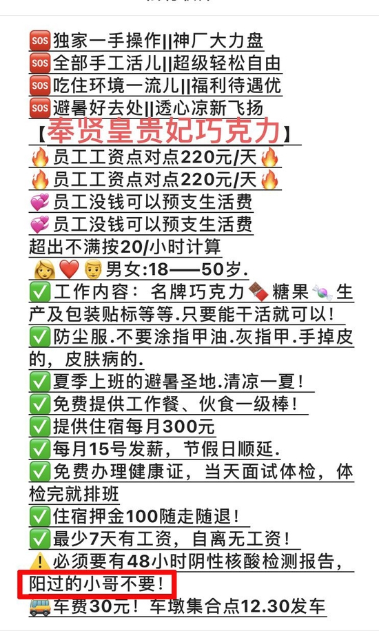 奉贤一家企业招工信息称,“阳过的小哥不要”。