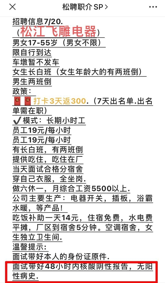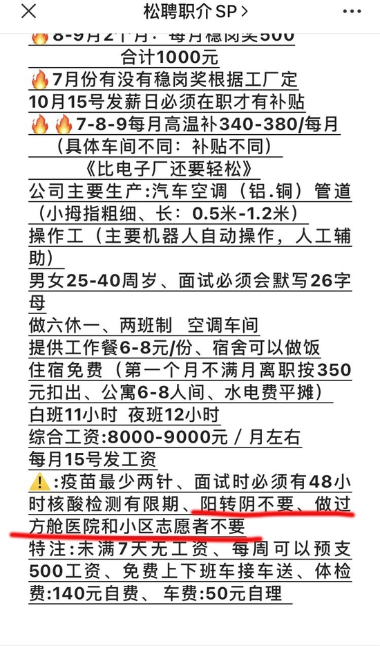 有少数招聘单位会直接标注,不要新冠康复者。根据松聘职介招工微信群7月19日消息,上海浦东LG电子厂“阳过的不要”,浦东北蔡汽车空调配件厂“阳转阴不要”“做过方舱医院和小区志愿者不要”, 松江飞雕电器要求“无阳性病史”。