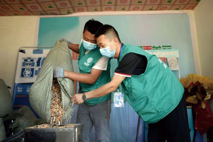 2022 年 6 月 2 日,山东聊城。环保创业人士时旭凯、姚海建采取线下上门回收和线上(抖音、快手)绿色回收相结合的模式,积极与再生资源回收企业合作对接, 将回收的废旧烟头通过机械分拣、化学处理,提取醋酸纤维和烟碱,实现废旧物资循环利用。(图 /IC)