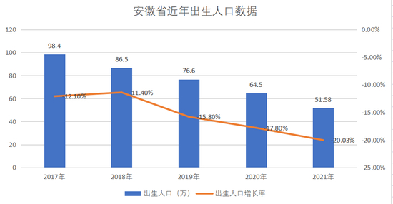 据安徽省全员人口数据库统计,2017年至2021年安徽省出生人口分别为98.4万、86.5万、76.6万、64.5万、53万(预测),年增长率为-12.1%、-11.4%、-15.8%,-17.8%,整体呈断崖式下降趋势。