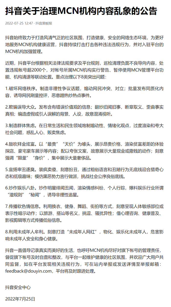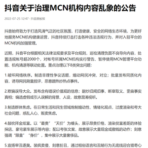 IT之家 7 月 25 日消息,7 月 25 日,抖音发布关于治理 MCN 机构内容乱象的公告,称近期抖音平台根据相关法律法规要求及平台规则,巡检清理负面不良导向内容,处置违规账号超 2000 个,对账号所属 MCN 机构实行警告、暂停使用 MCN 管理平台功能、机构清退等联动处置。重点治理鼓吹拜金炫富、传播软色情信息、利用未成年人牟利等 8 类突出问题。