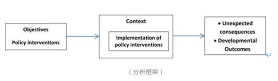 为了理解影响越南电子工业发展的各种因素,我们使用了新的分析框架,这一框架包括四个层面:(1)政策干预的目标;(2)背景;(3)政策干预的实施;(4)指导数据收集和分析的结果。我们还将结果区分为意外后果和发展结果。