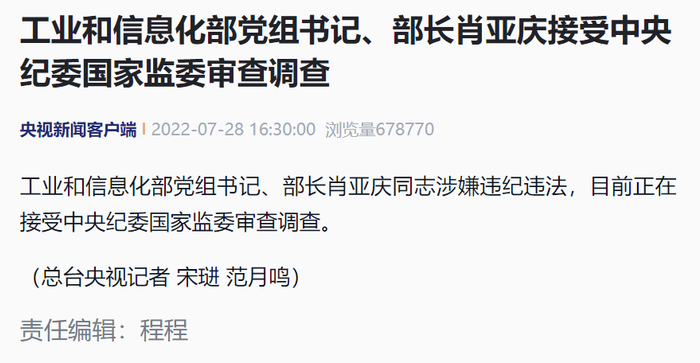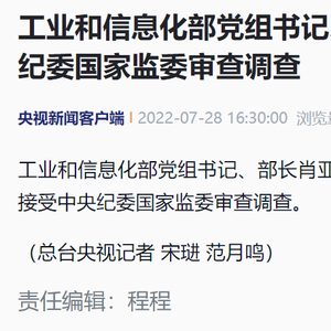 据央视新闻,工业和信息化部党组书记、部长肖亚庆同志涉嫌违纪违法,目前正在接受中央纪委国家监委审查调查。