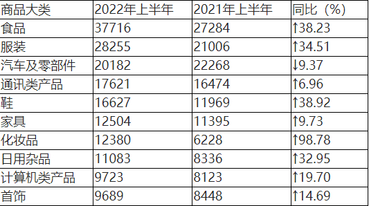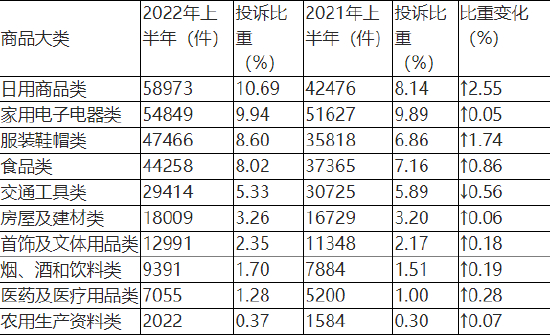 根据2022年上半年商品大类投诉数据(如图2、表2所示),日用商品类、家用电子电器类、服装鞋帽类、食品类和交通工具类投诉量居前五位。