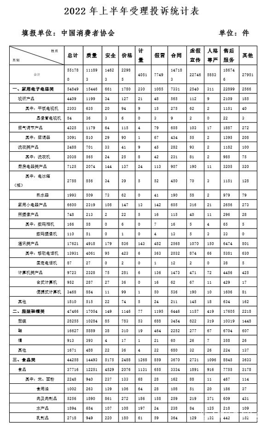 2022年上半年全国消协组织受理投诉情况发布