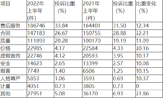与2021年上半年相比(如表1所示),售后服务类投诉比重上升较快,合同类投诉比重下降明显,其余类投诉变化幅度较小。