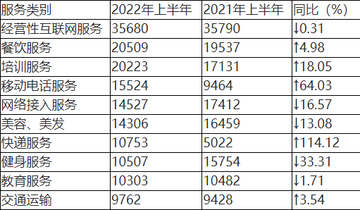在具体服务投诉中,投诉量居前五位的分别为(如图5、表5所示)经营性互联网服务、餐饮服务、培训服务、移动电话服务、网络接入服务。与2021年上半年相比,快递服务和交通运输进入服务类投诉前十。其中快递服务同比增长较高,健身服务同比下降较多。