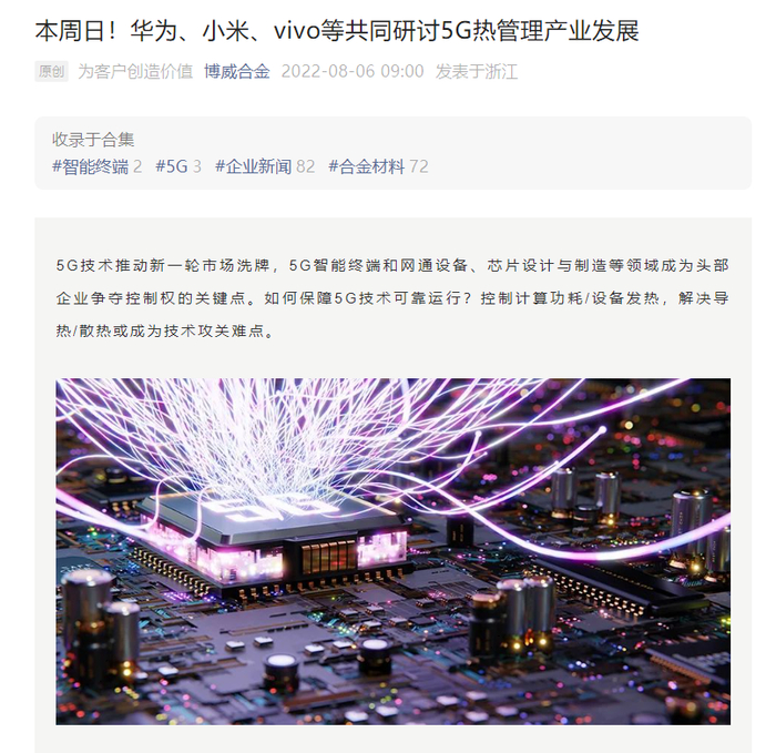据博威合金介绍,其将在会议中进行《高性能铜合金在热管理领域的应用》主题演讲。演讲将介绍 5G 商用普及对散热技术与产品的促进、以均温板为代表的液冷散热在 5G 手机中的作用等内容。