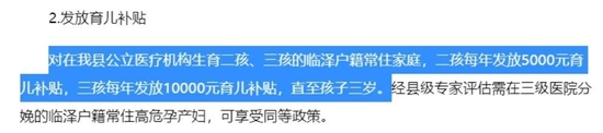 今年6月,陕西凤县县委县政府出台《凤县优化生育政策促进人口长期均衡发展的实施方案》。方案提出,从2022年6月起,凡凤县户籍常住产妇生育二孩、三孩的,且小孩已在凤县进行户口登记的,县财政分别给予3000元、5000元的一次性生育补贴奖励。