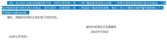 8月8日,温州龙湾区官网消息显示,该区正谋划出台育儿补贴发放规范性文件,对符合条件的二孩、三孩户籍家庭发放育儿补贴,二孩每月每孩发放500元育儿补贴金,三孩每月每孩发放1000元育儿补贴金,直至3周岁。