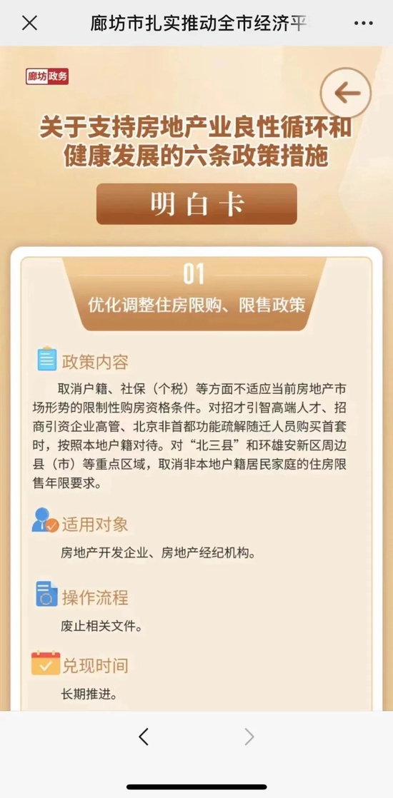近日,河北廊坊市政府发布了《关于支持房地产业良性循环和健康发展的六条政策措施明白卡》,文件称,取消户籍、社保(个税)等不适应当前房地产市场形势的限制性购房条件。同时还特意强调:对“北三县”(三河市、大厂回族自治县以及香河县)和“雄安新区周边”的住房限售年限要求也全面取消。