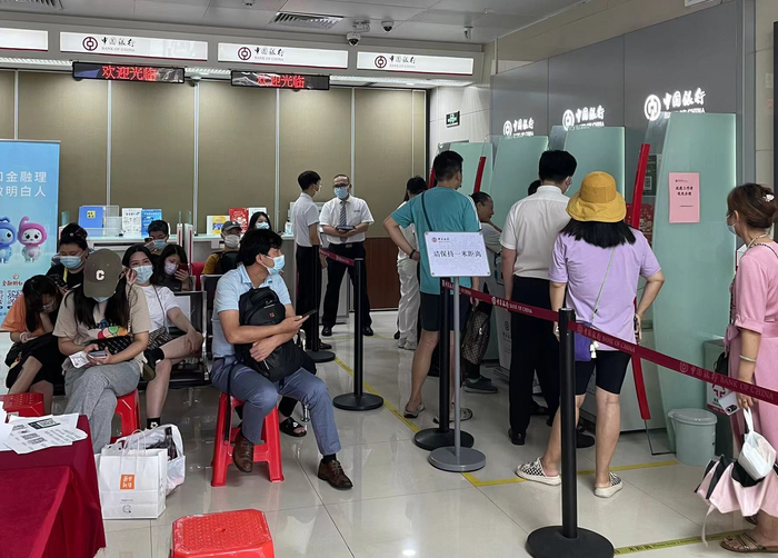记者走访深圳多家中国银行的线下网点发现,的确有不少人在等待办理此项业务。一名工作人员对记者表示,现场办理业务的客户基本都是因为银行卡被冻结前来解锁。他向记者解释称,由于配合公安部门开展“断卡”行动,要求银行对各账户进行排查,识别到资金有风险就会冻结银行卡。客户可到线下网点或登录小程序“中银在家”进行处理,正常情况下会在2-3个工作日内办结。