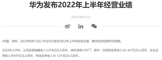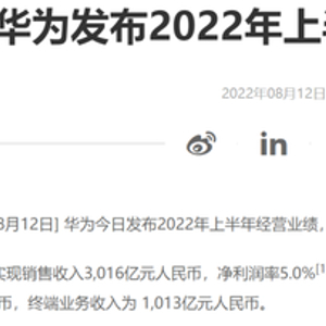 8月12日下午,华为发布2022年上半年经营业绩显示,公司实现销售收入3016亿元,净利润率5%。其中,运营商业务收入1427亿元、企业业务收入547亿元、终端业务收入1013亿元。