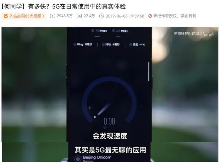 吐槽iPhone X Face ID,是身为果粉的何同学成为B站科技UP主的第一个作品。他最早的视频大多也是数码产品的测评,是圈子里小有名气的视频创作者。直到2019年6月,何同学发布了一条名为《有多快?5G在日常使用中的真实体验》的视频。这支视频目前在B站被播了2948.5万次,至今仍是他播放最多的作品。