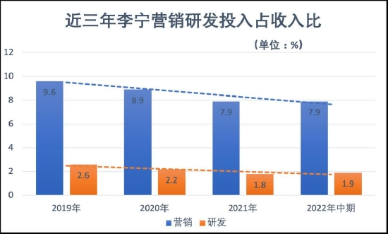 需要注意的是,虽然 2021 年和今年上半年李宁在营销和研发上的投入金额都同比增长,但最近三年,这两项支出占其收入的比例一直在下降。