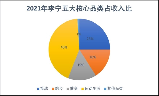 2021 年,运动生活品类在李宁的营收中占比高达 43%,远高于篮球、跑步、健身和其他品类。