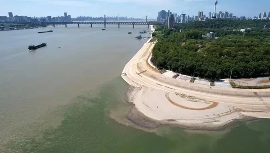 8月15日,在湖北省武汉市,长江与汉江的交汇处的汉阳南岸嘴露出大片沙滩。图/中新社