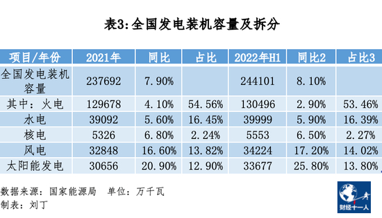 从2021年底到2022年上半年,水电的装机容量同比增速分别为5.6%和5.9%;而风电为16.6%和17.2%,太阳能发电则为20.9%和25.8%。