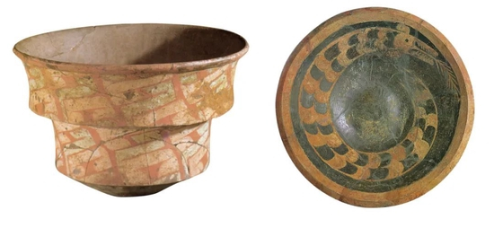 (左)陶寺遗址出土的彩绘折腹盆。(右)陶寺遗址出土的蟠龙纹陶盘。图/社科院考古所山西考古队