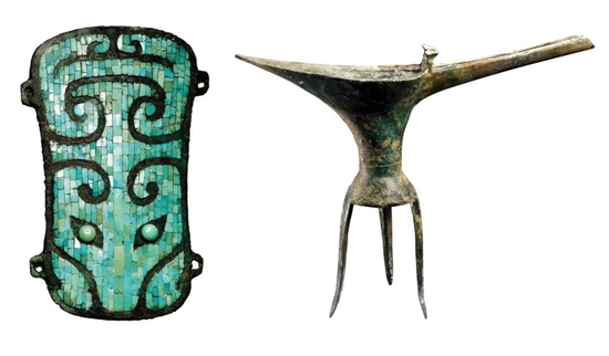 (左)二里头遗址出土的铜牌饰。(右)二里头遗址出土的铜爵,有“华夏第一爵”之称。图/社科院考古所二里头考古队