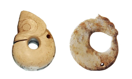 (左)辽宁朝阳市建平县牛河梁遗址出土的“玉猪龙”。(右)安徽含山县凌家滩遗址出土的玉龙。图/中新