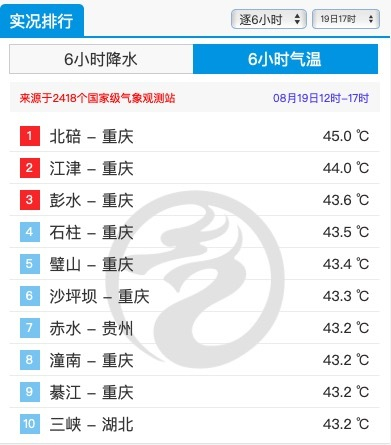 此外,据中央气象台19日17时发布的气温排行榜中,重庆有八地进入Top10,北碚以45℃位列第一,超43℃才能上榜。