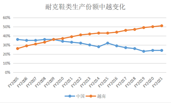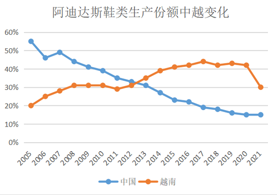 老牌巨头耐克和阿迪达斯的转移更直观一些——两家公司都是从21世纪初开始逐渐降低在中国的生产份额,并在越南等东南亚国家不断加码。