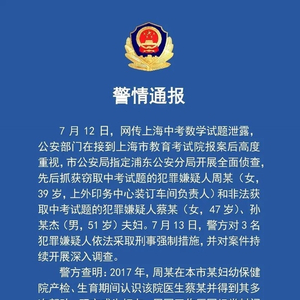 8月22日,上海市公安局浦东分局发布通报称,已对窃取中考试题的犯罪嫌疑人周某和非法获取中考试题的犯罪嫌疑人蔡某、孙某杰夫妇依法采取刑事强制措施。