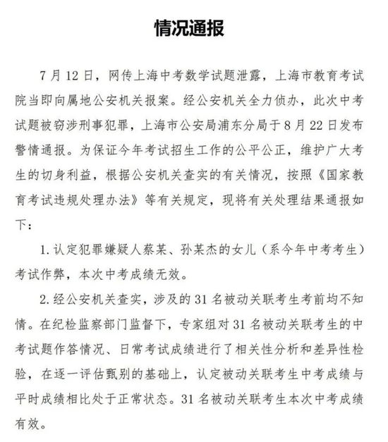同日,上海市教育考试院也发布情况通报称,根据公安机关查实的有关情况,按照《国家教育考试违规处理办法》等有关规定,认定犯罪嫌疑人蔡某、孙某杰的女儿(系今年中考考生)考试作弊,该生中考成绩无效。