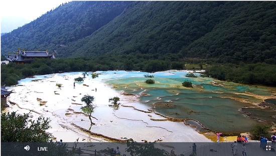 景区提供的8月22日下午实时监控截屏和近期航拍视频显示,望龙坪,五彩池、争艳池、飞瀑流辉等景点水量充沛,吸引了不少游客前去打卡。黄龙景区虽然有一些彩池水位下降,但是在航拍画面中一池池碧水犹如镶嵌在绿色森林中的蓝宝石,愈发明艳动人。