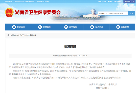 湖南卫健委网站8月26日消息显示,湖南省卫生健康委、中南大学通报,针对网民反映的中南大学湘雅二医院副主任医师刘翔峰有关问题,湖南省卫生健康委、中南大学8月19日成立联合调查组开展调查,并通过湖南省医学会组织6名医学专家(其中省外专家4名、省内专家2名)对其医疗行为进行专业核查。