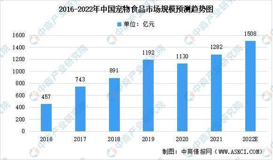 国内宠物食品市场规模预测趋势图 数据来源:《2021年中国宠物行业白皮书》、中商产业研究院整理