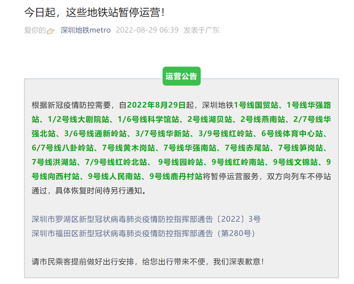 29日早,深圳地铁发布通知称,根据新冠疫情防控需要,自2022年8月29日起,深圳地铁1号线国贸站、1号线华强路站、1/2号线大剧院站、1/6号线科学馆站、2号线湖贝站、2号线燕南站、2/7号线华强北站、3/6号线通新岭站、3/7号线华新站、3/9号线红岭站、6号线体育中心站、6/7号线八卦岭站、7号线黄木岗站、7号线华强南站、7号线赤尾站、7号线笋岗站、7号线洪湖站、7/9号线红岭北站、 9号线园岭站、9号线红岭南站、9号线文锦站、9号线向西村站、9号线人民南站、9号线鹿丹村站将暂停运营服务,双方向列车不停站通过,具体恢复时间待另行通知。