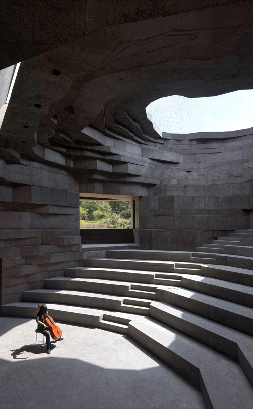 仿佛一块巨石降落在长城脚下的山谷中,这座半室外音乐厅由混合了当地岩石碎料的灰色混凝土浇筑而成。朝向天空的开洞不仅引入了天空与光线,更经过了严谨的声学计算,确保音乐厅内的最佳音响效果。