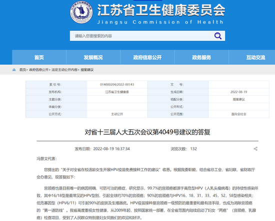 江苏省卫健委网站在8月19日发布的“对省十三届人大五次会议第4049号建议的答复”中表示: