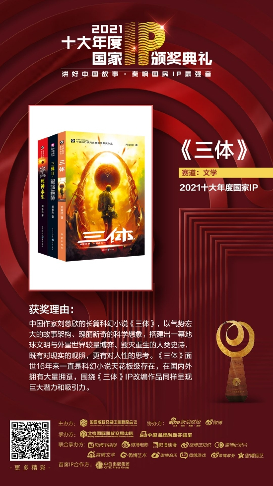 2022年9月3日,2021十大年度国家IP颁奖典礼在陕西延安红街盛大举行。其中,刘慈欣的作品《三体》获得2021年十大年度国家IP。