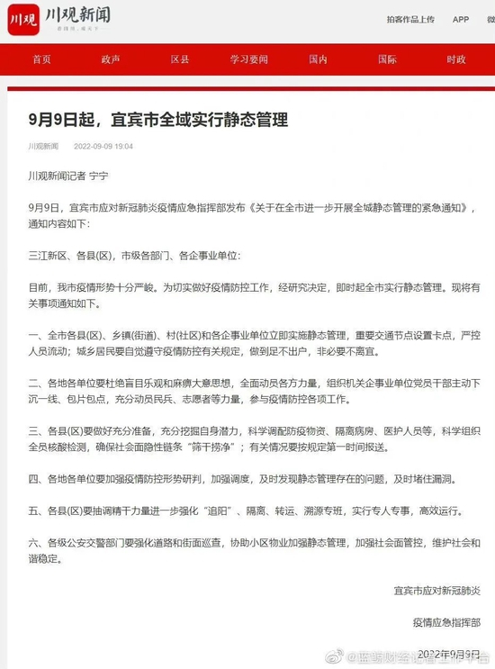 9月9日,宜宾市应对新冠肺炎疫情应急指挥部发布《关于在全市进一步开展全城静态管理的紧急通知》,全市各县(区)、乡镇(街道)、村(社区)和各企事业单位立即实施静态管理,重要交通节点设置卡点,严控人员流动;城乡居民要自觉遵守疫情防控有关规定,做到足不出户,非必要不离宜。