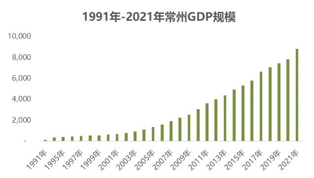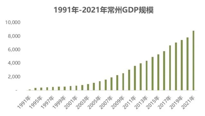 在上述因素的作用下,常州经济很快发展起来了。数据显示,常州的经济规模从1991年的105亿元增长至2021年的8808亿元,29年间增长83倍,GDP年复合增长率17%。