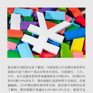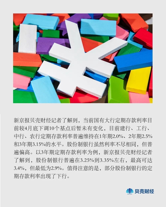 值得注意的是,部分股份制银行的定期存款利率出现了下行。某银行工作人员告诉新京报贝壳财经记者,该行3年期定期存款利率为3.3%,较一个月前下调了10个基点。另有股份制银行工作人员表示,当前该行3年期定期存款仍有3.4%的额度,已是当前主流银行中最高的利率水平,但预计近期将会下调。
