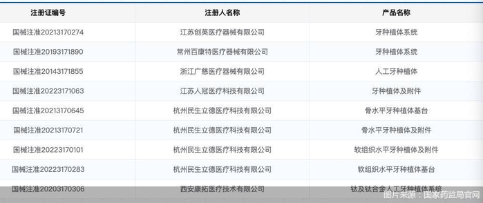 民生立德医疗是拥有骨水平牙种植体基台、骨水平牙种植体及附件、软组织水平牙种植体及附件等四款产品的国内厂商。根据国家药监局官网信息,包括民生立德医疗在内,牙种植体,牙种植体系统获得三类医疗器械证的国内厂商共有16家。