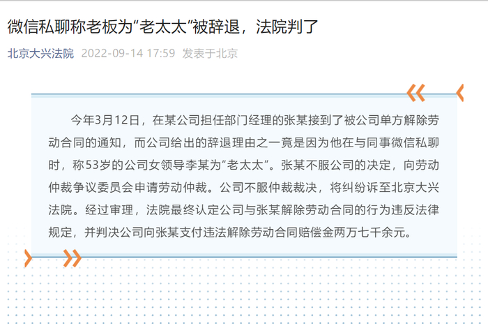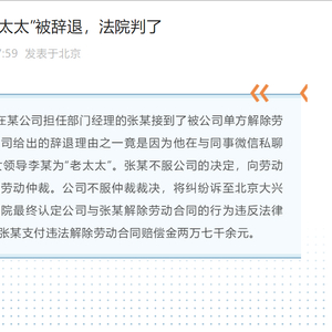 日前,据北京大兴法院披露一则案例显示,今年3月12日,在某公司担任部门经理的张某接到了被公司单方解除劳动合同的通知,而公司给出的辞退理由之一竟是因为他在与同事微信私聊时,称53岁的公司女领导李某为“老太太”。张某不服公司的决定,向劳动仲裁争议委员会申请劳动仲裁。公司不服仲裁裁决,将纠纷诉至北京大兴法院。