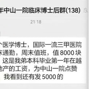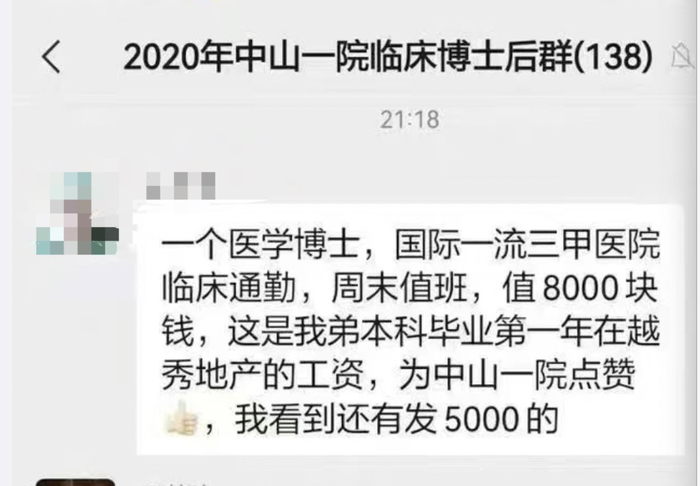 9月13日中午,一张“2020年中山一院临床博士后群”的群聊截图,在互联网上引发不少热议。该群内一名博士后毕业生表示,其当月的工资只有8000元,还有临床医生月薪甚至只有5000元。该毕业生表示薪酬波动巨大,质疑中山一院薪酬体系设计。
