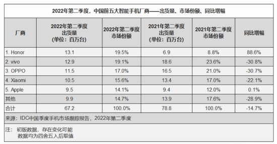 据IDC发布的手机季度跟踪报告显示,2022年第二季度,荣耀出货量为1310万台,同比增长高达88.6%,以19.5%的市场份额位列首位。相较其他安卓手机厂商20%-30%的下滑数据,荣耀表现确实不错。