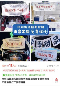 于是,2.0时代的地摊经济造福了某多多。在某平台上,文艺、小资情调的“地摊神器”,销量十分火爆。比如,定制摆地摊挂布(招牌),10元一张,销量10W+;