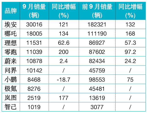 除埃安、哪吒外,理想、零跑、蔚来、问界9月销量也均实现破万,分别为11531辆、11039辆、10878辆、10142辆。今年9月,小鹏销量为8468辆,为统计中唯一一家销量同比负增长的车企,不过其前9个月累计销量超9.8万辆,排在埃安和哪吒之后,位列第三。