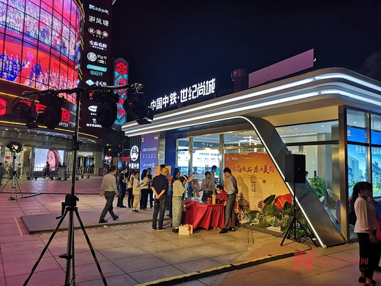 10月1日晚上7时许,百联南桥购物中心附近的广场上,两组照明大灯打向广场中央的中铁世纪尚城项目展厅,不少路人围着门口的糖画摊,工作人员身着红色喜庆的礼服。